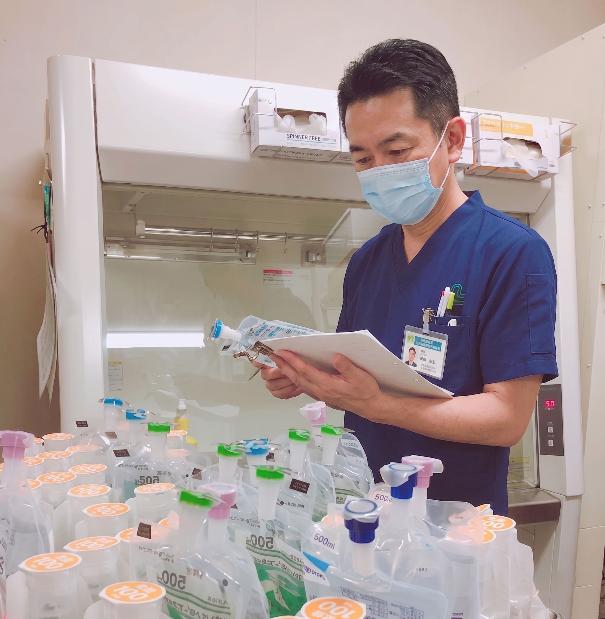 栄養が十分でない患者さんに中心静脈(体を巡る大きな静脈)から高カロリーの輸液を投与します。この輸液を混合する際に細菌汚染しないよう、クリーンベンチという機械の中で清潔に調製します。