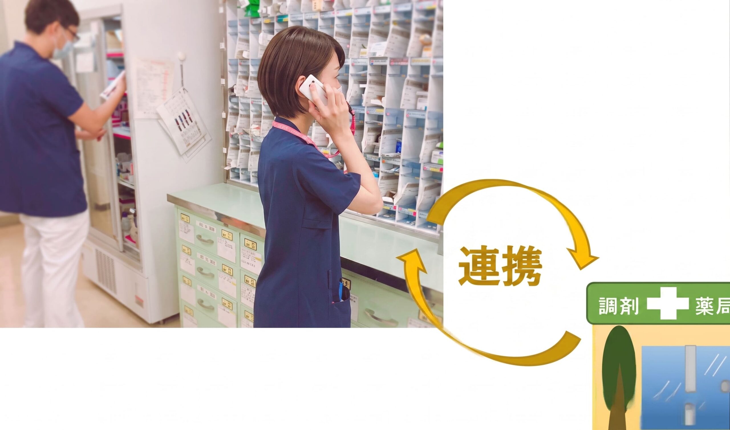 病院と調剤薬局の薬剤師が患者さんの情報を共有し、入院前から、入院中も退院してからも充実した医療を継続して受けることができるように連携しています。