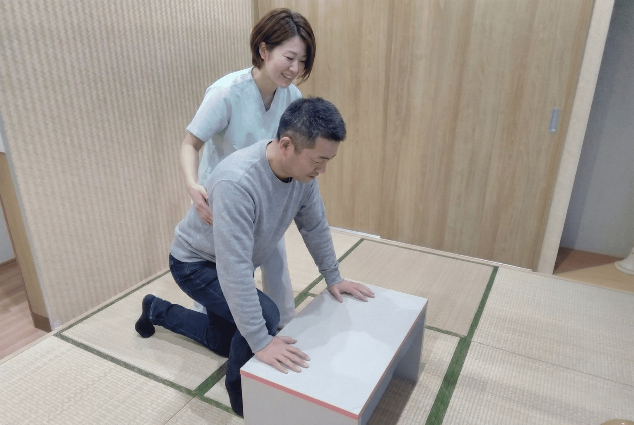 床上動作訓練退院後の自宅環境に合わせ、床からの立ち座りの練習を行います。